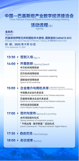 В целях углубления китайско-пакистанского сотрудничества в области цифровой экономики и содействия цифровой трансформации и модернизации промышленности Посольство Исламской Республики Пакистан в Пекине и компания IBI (603613. SH) совместно проводят «Китайско-пакистанскую встречу по обмену в области промышленной цифровой экономики», которая состоится во второй половине дня 13 сентября 2025 года в Пекинском международном конференц- и выставочном центре Шоуган.